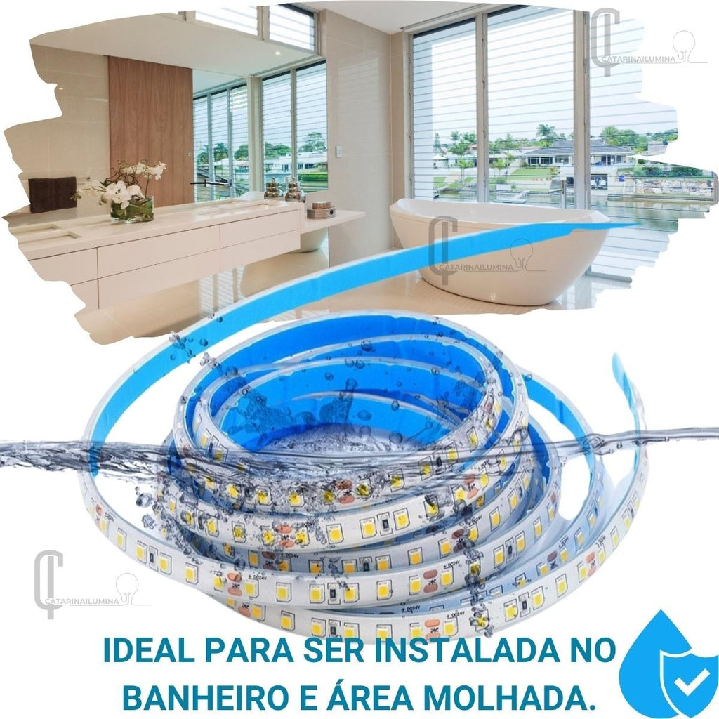 Iluminação Piscina de Fita LED IP68. Com 5 metros de comprimento, 240 LEDs e proteção IP68, essa fita garante uma iluminação eficiente e durável. O tom branco quente de 3000k cria uma atmosfera acolhedora para momentos relaxantes.